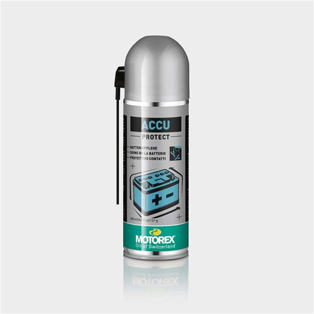 MOTOREX ACCU PROTECT SPRAY schützt Batteriepole, Polklemmen, Steckverbindungen, Anlasser- und Anschlusskabel.