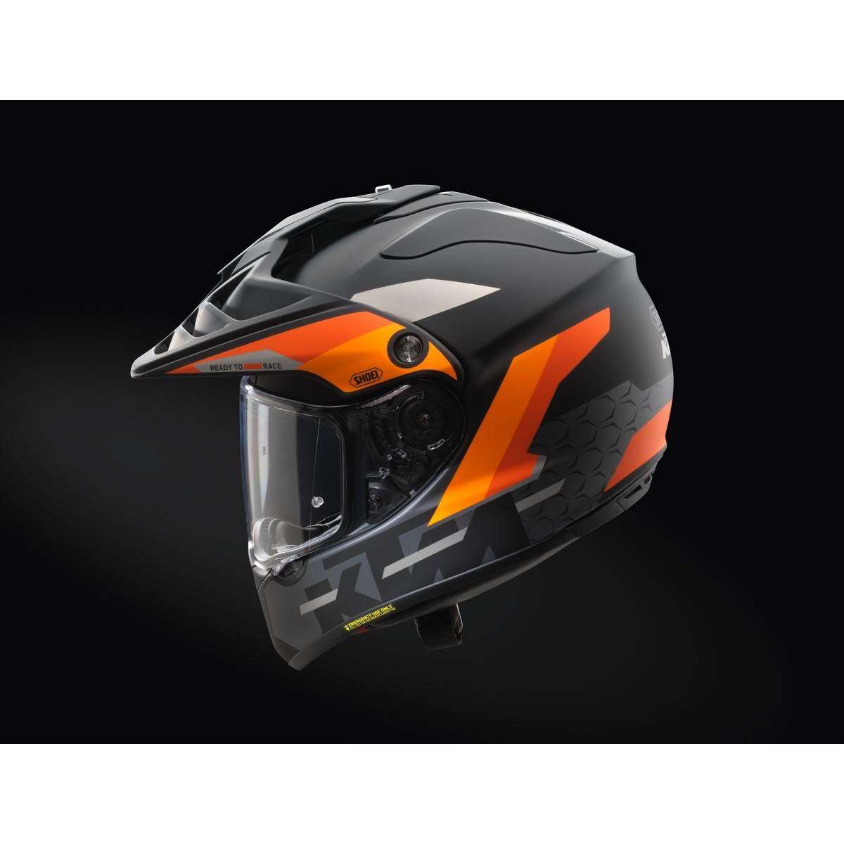 Hochleistungs-Aerodynamik Gewicht 1.500 g (± 50 g) Exklusiv für KTM von Shoei Effektives Be- und Entlüftungssystem AIM+-Helmschale Vier Schalengrößen Doppel-D-Ring-Verschluss E. Q. R. S. (Emergency Quick Release System) (Wangenpolster zum Herausziehen) 3-D-Polstersystem Schnellwechselvisier Aerodynamischer Adventure-Helm